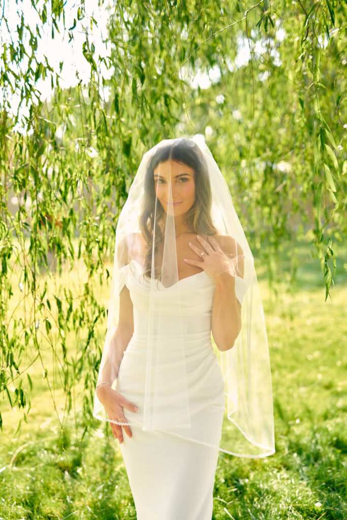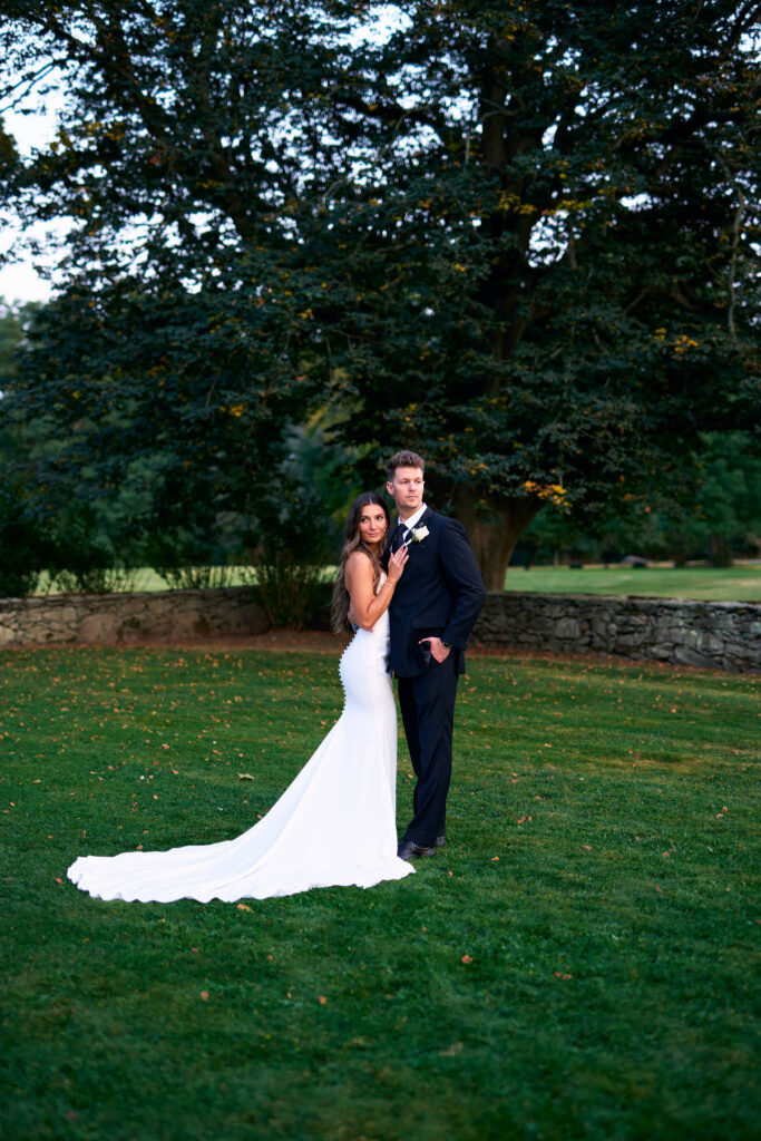 The outdoor ceremony space is surrounded by greenery that glows beautifully at golden hour. The property has so many great spots for portraits, from the long stone walls to the open lawns and private corners of the grounds. Elaina and Andrew and I spent some time during cocktail hour taking portraits all over the property. This venue has so many amazing spots, I could find new corners to fall in love with every time.