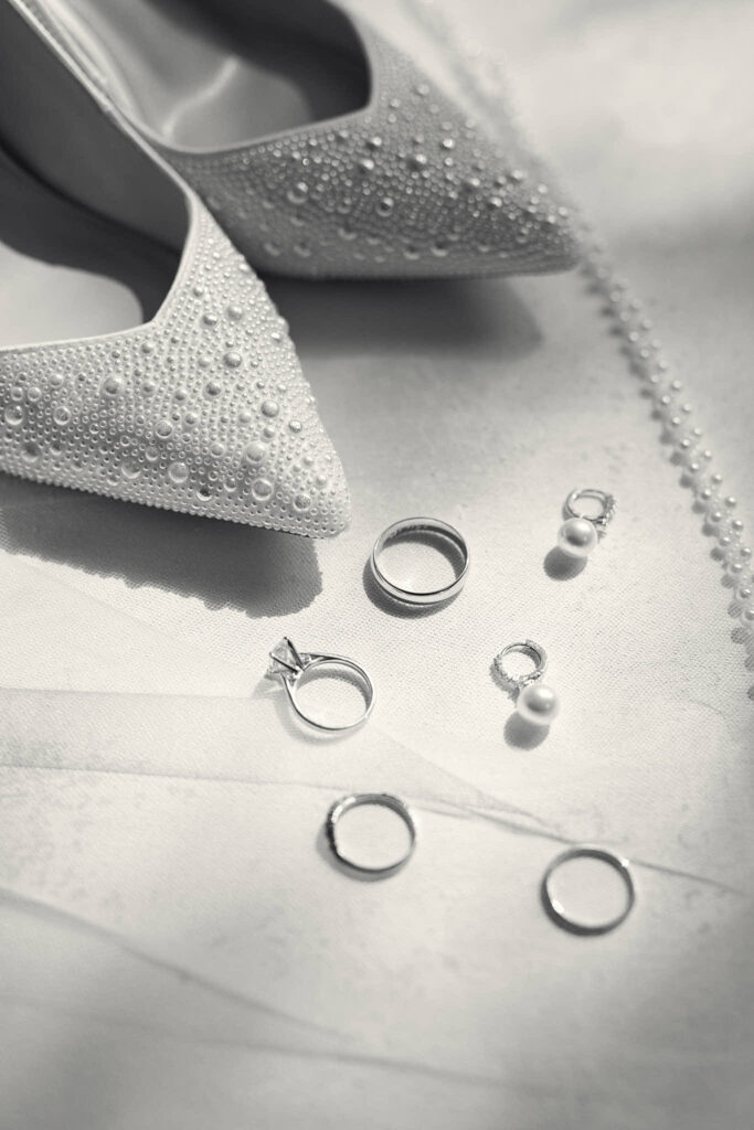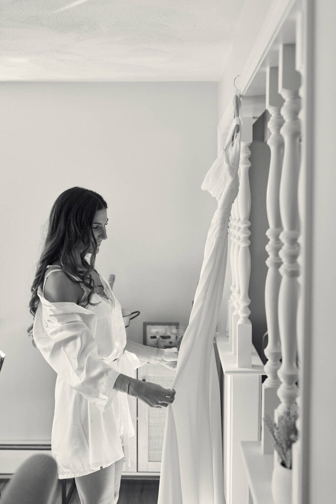 Documentary black and white image of a bride getting ready